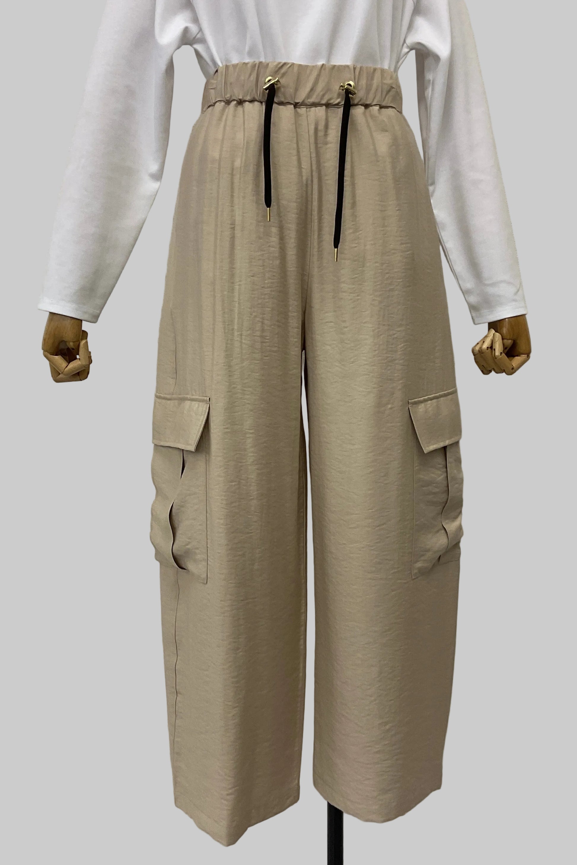 落ち感のあるワッシャーデシン素材を使用したカーゴパンツ。