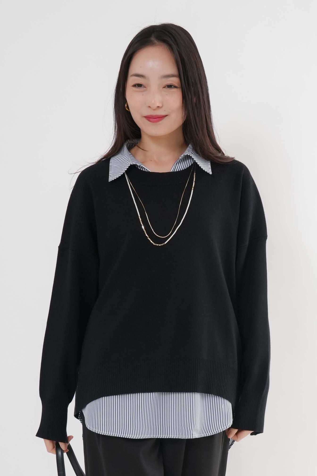 ゆったりとしたリラックスシルエットニットと、シャツのレイヤードデザインで、1着で上品なコーディネートが完成します。