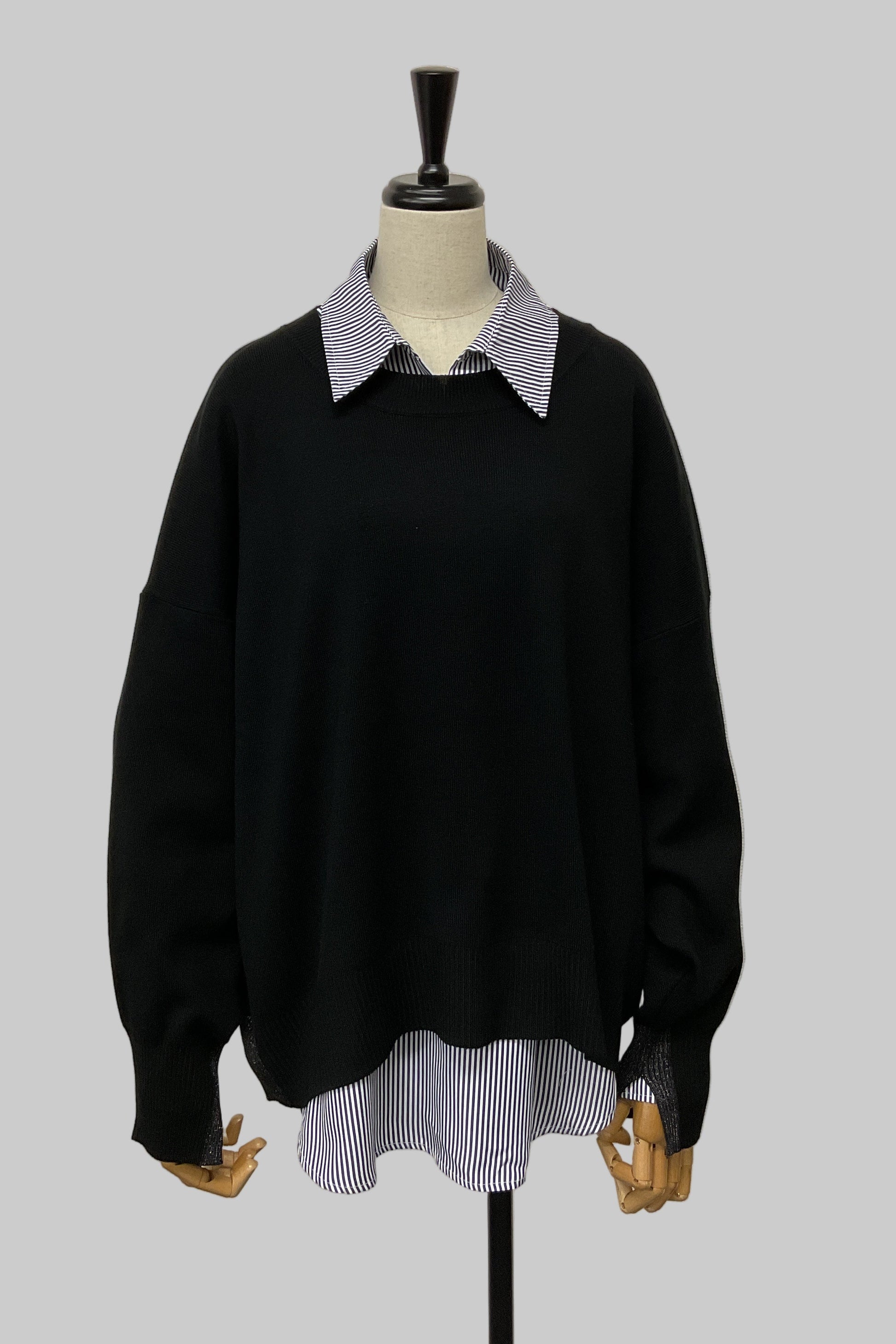ゆったりとしたリラックスシルエットニットと、シャツのレイヤードデザインで、1着で上品なコーディネートが完成します。