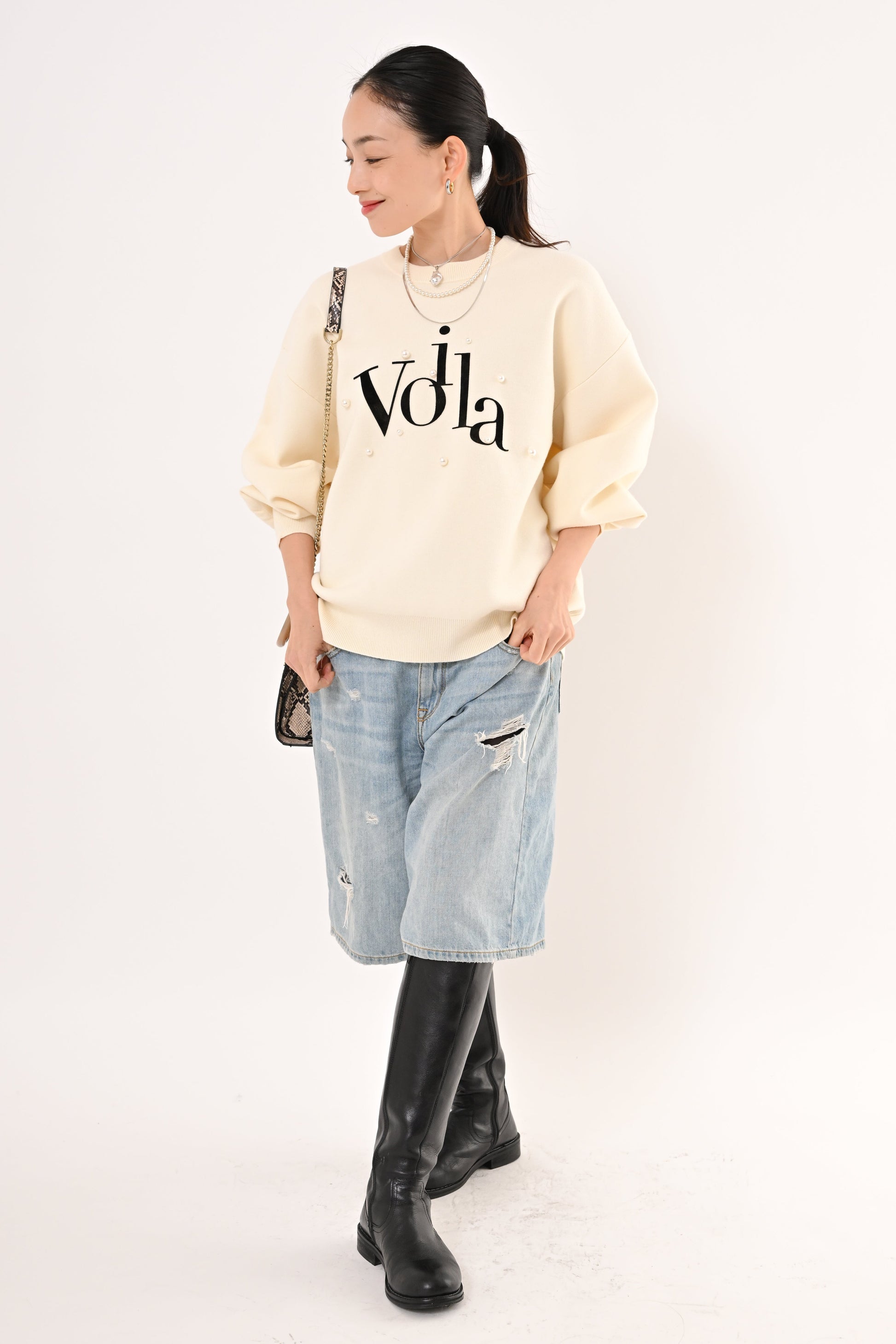 この冬、トレンドのロゴデザインをフェミニンなパール装飾でブラッシュアップした、洗練ムード漂うニットが登場。