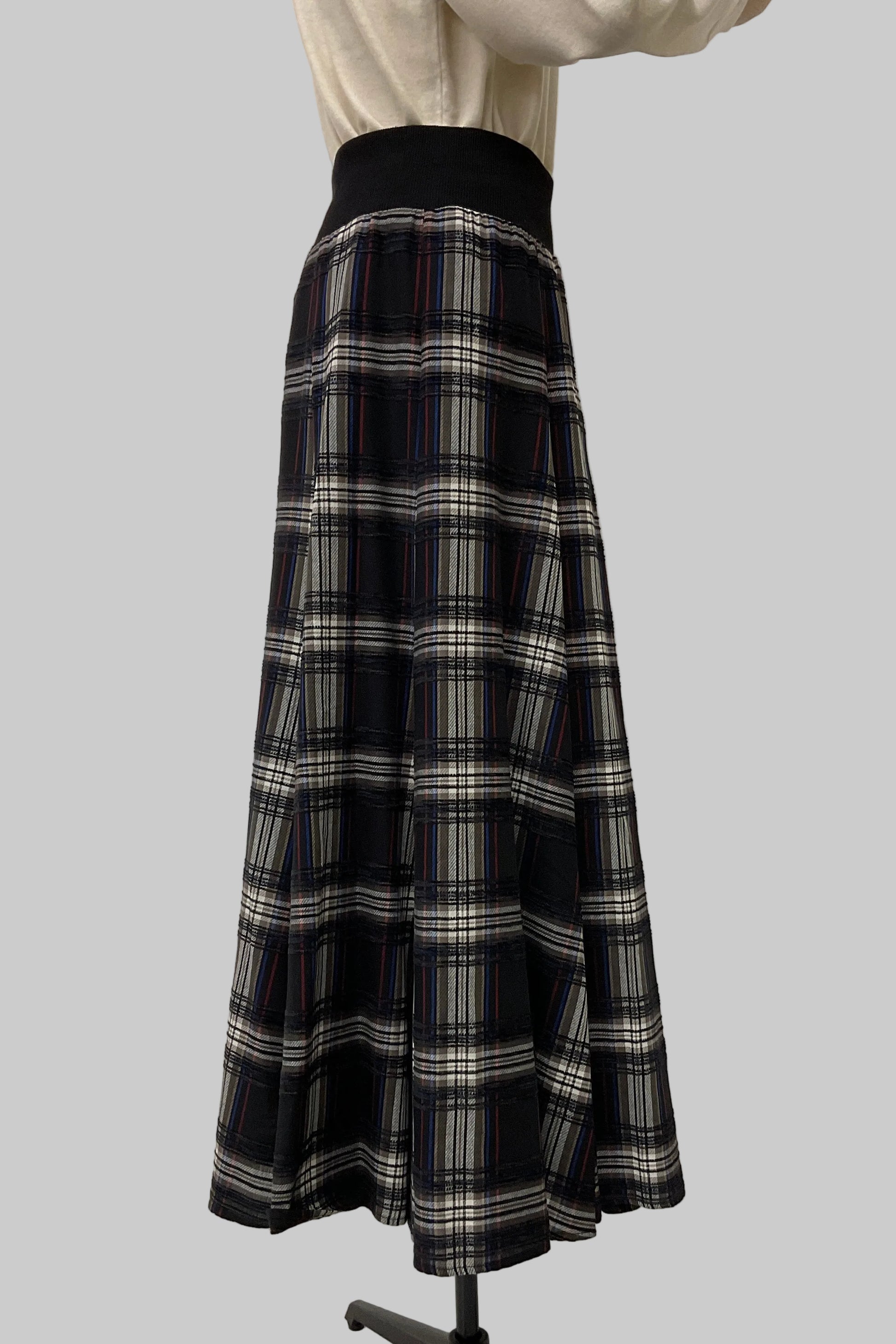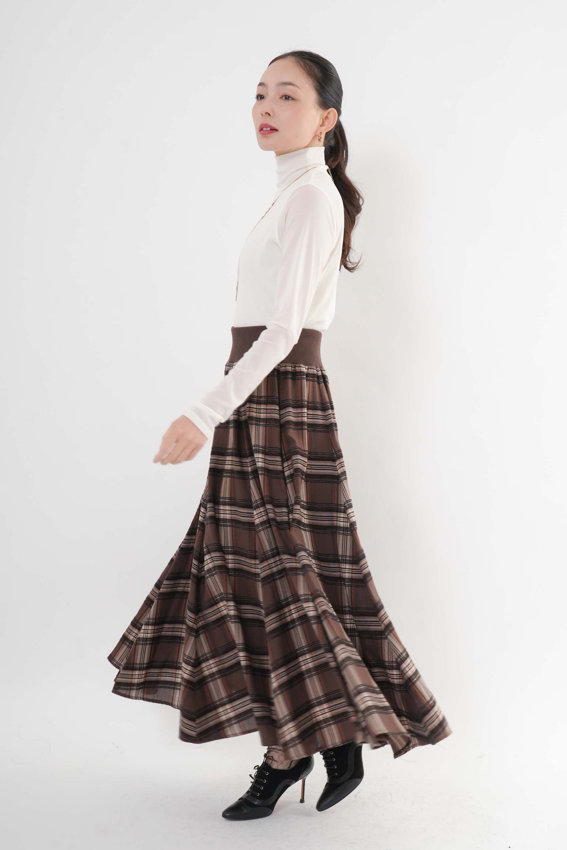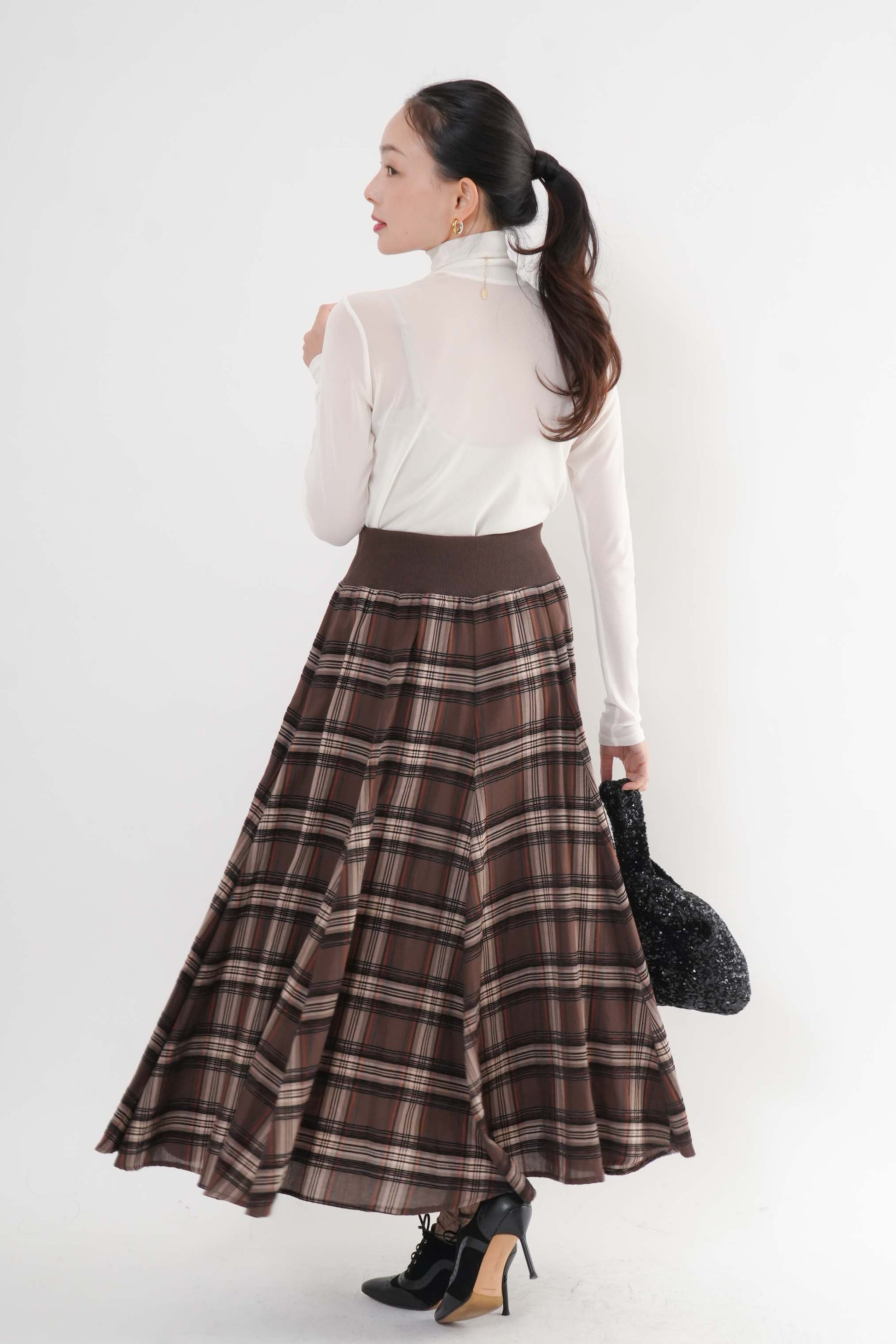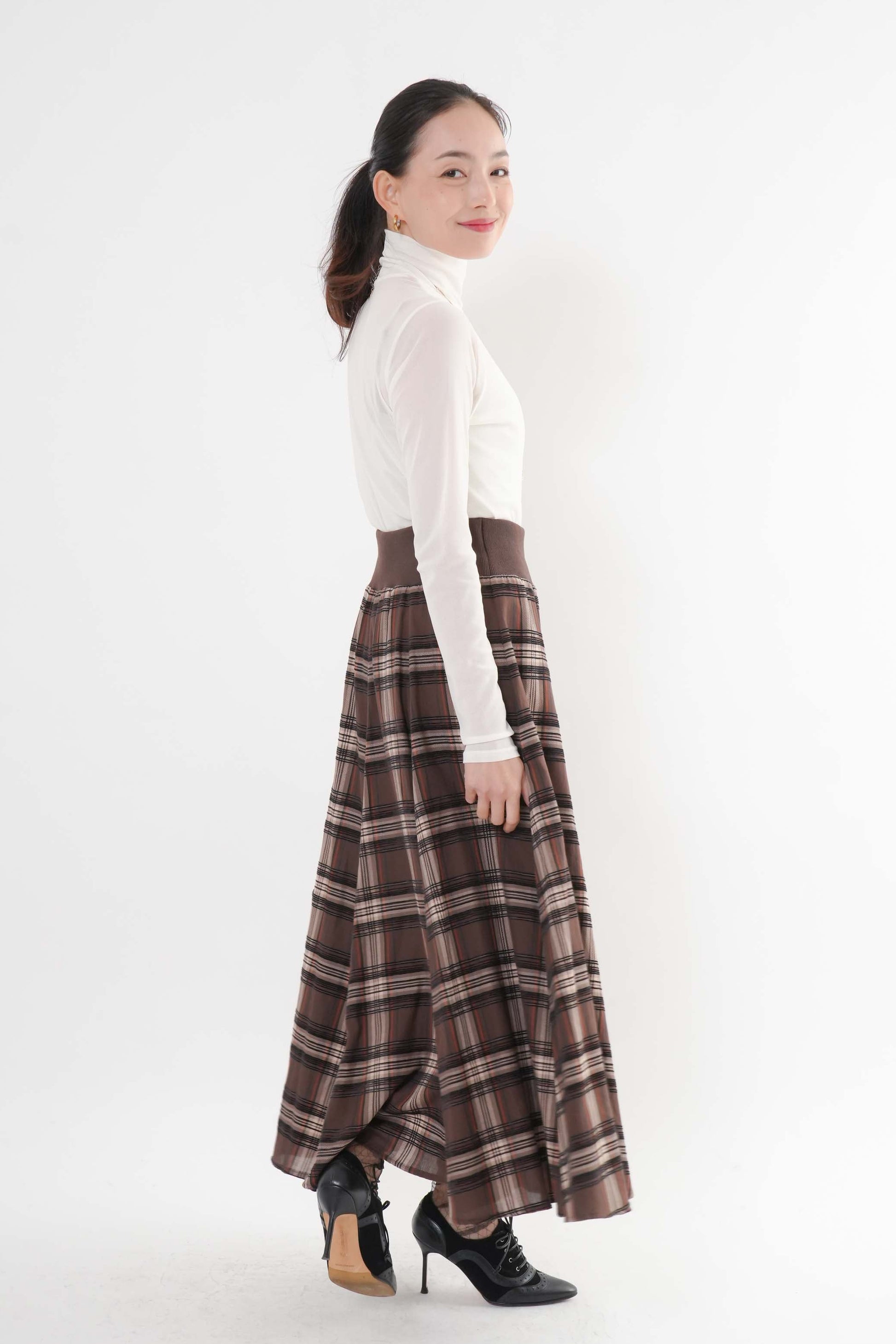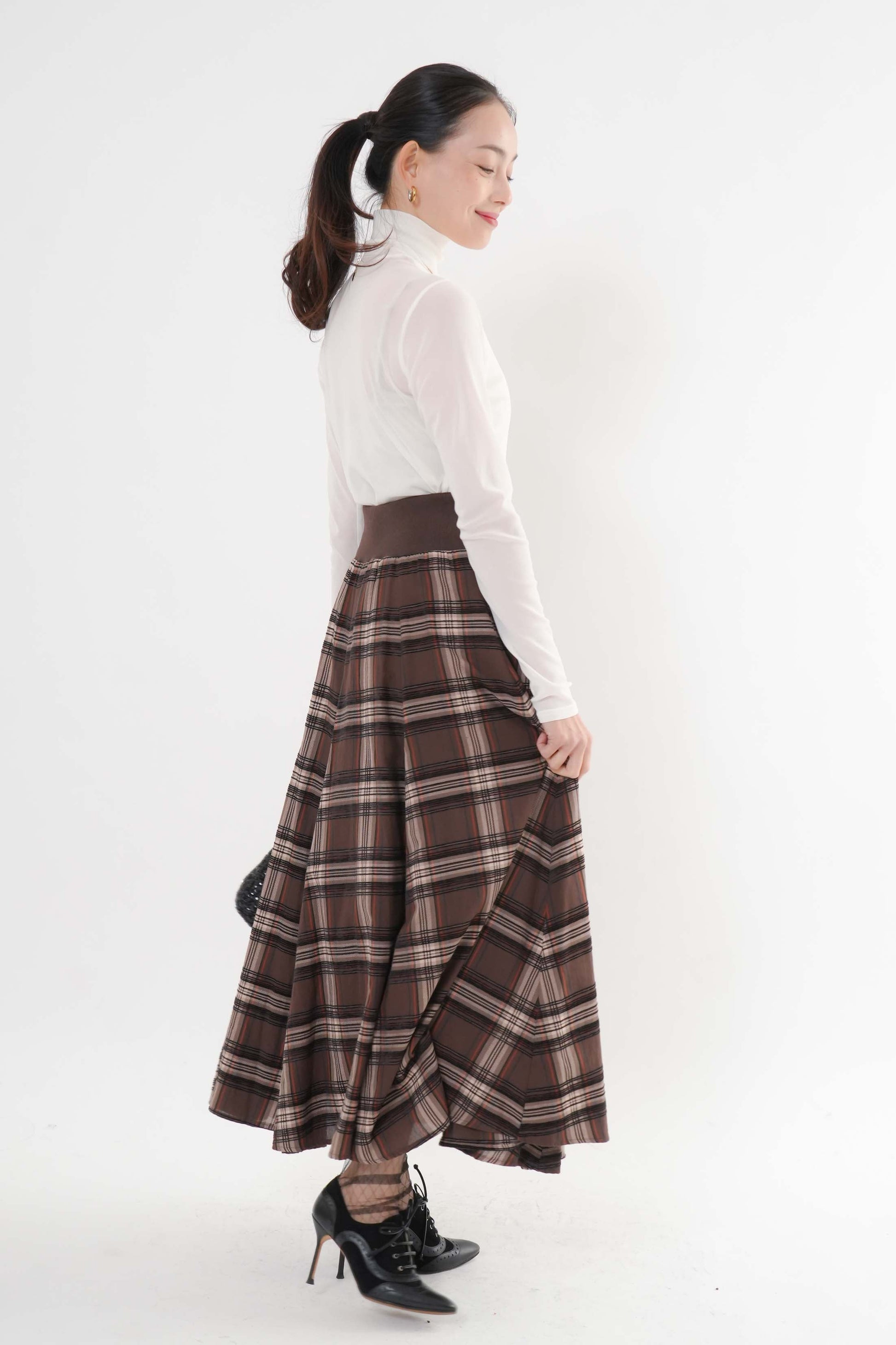 落ち着いたチェック柄に、ふわっと広がるフレアシルエットを添えたロングスカート。 ウエストはゴム仕様で、締めつけ感を抑えながらもウエストマークデザインできます。 気軽に揺れる移動量で、歩くたびに自然な流れで、さりげなく