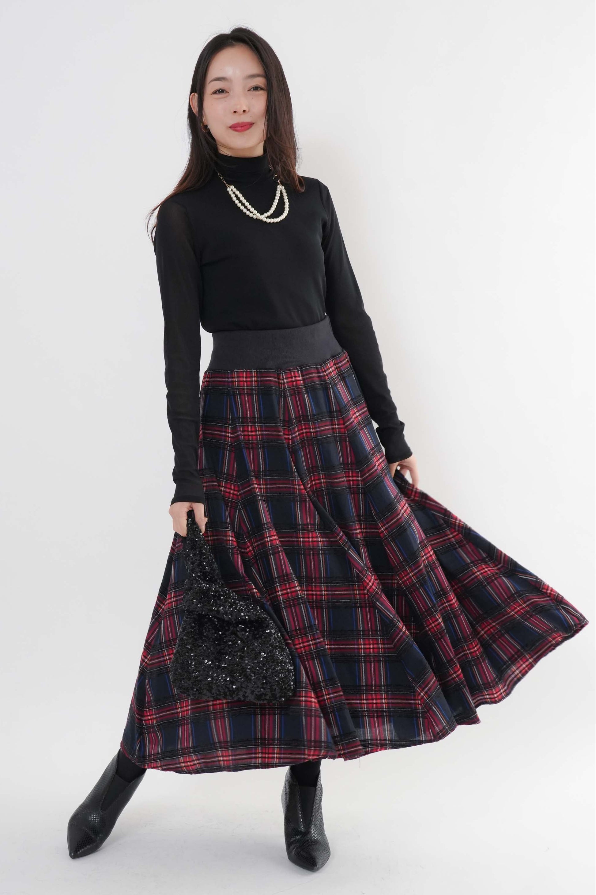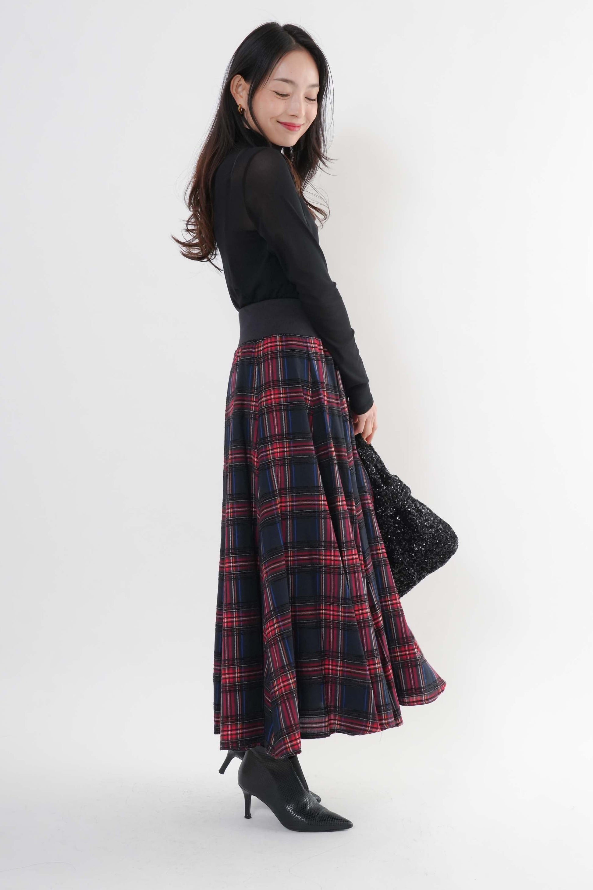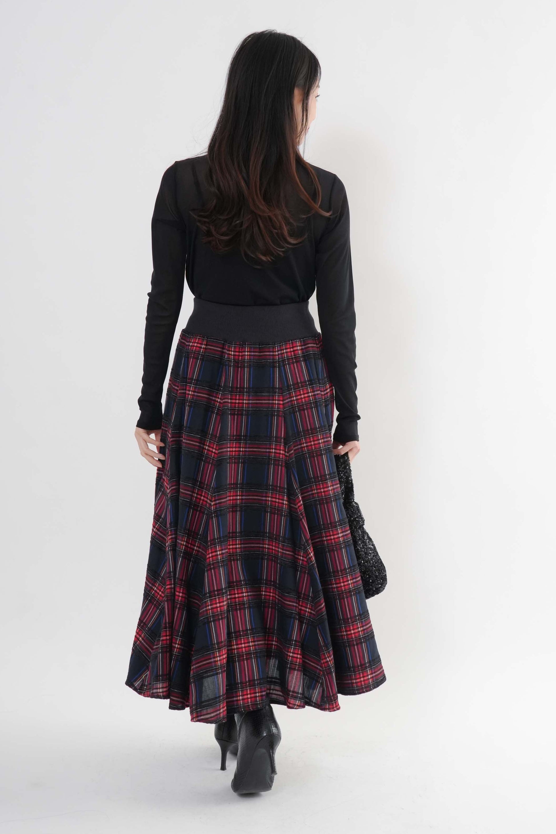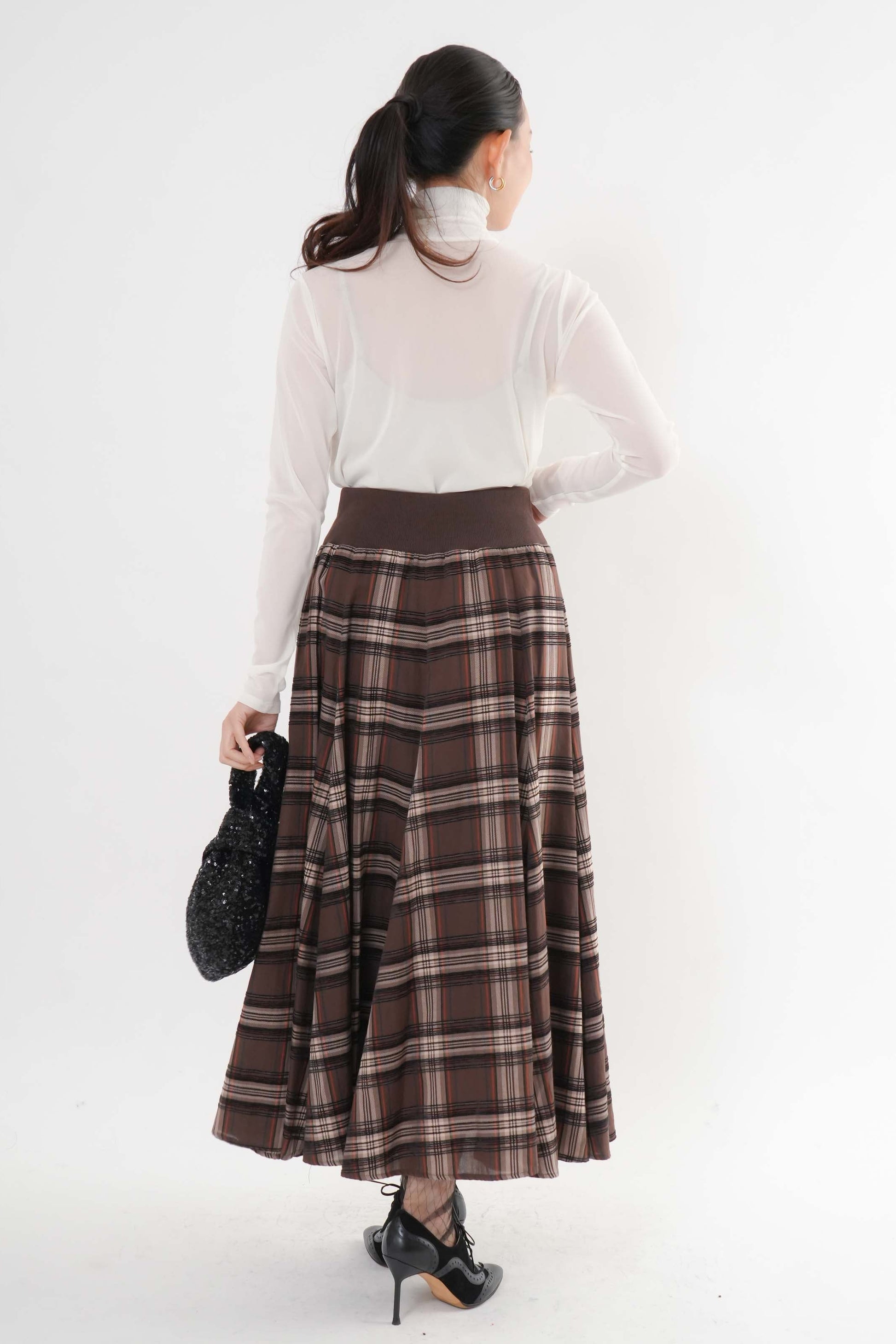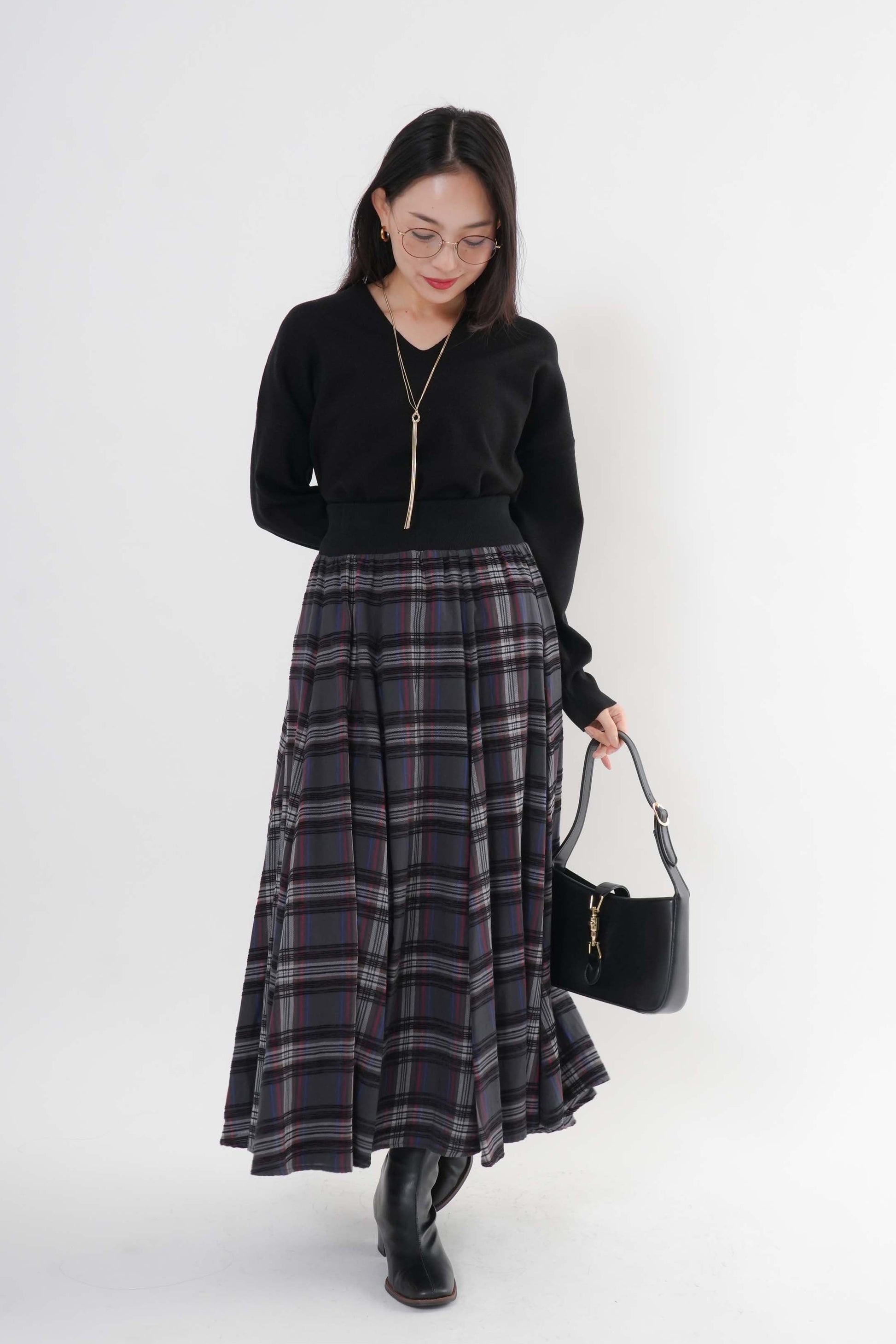 落ち着いたチェック柄に、ふわっと広がるフレアシルエットを添えたロングスカート。 ウエストはゴム仕様で、締めつけ感を抑えながらもウエストマークデザインできます。 気軽に揺れる移動量で、歩くたびに自然な流れで、さりげなく