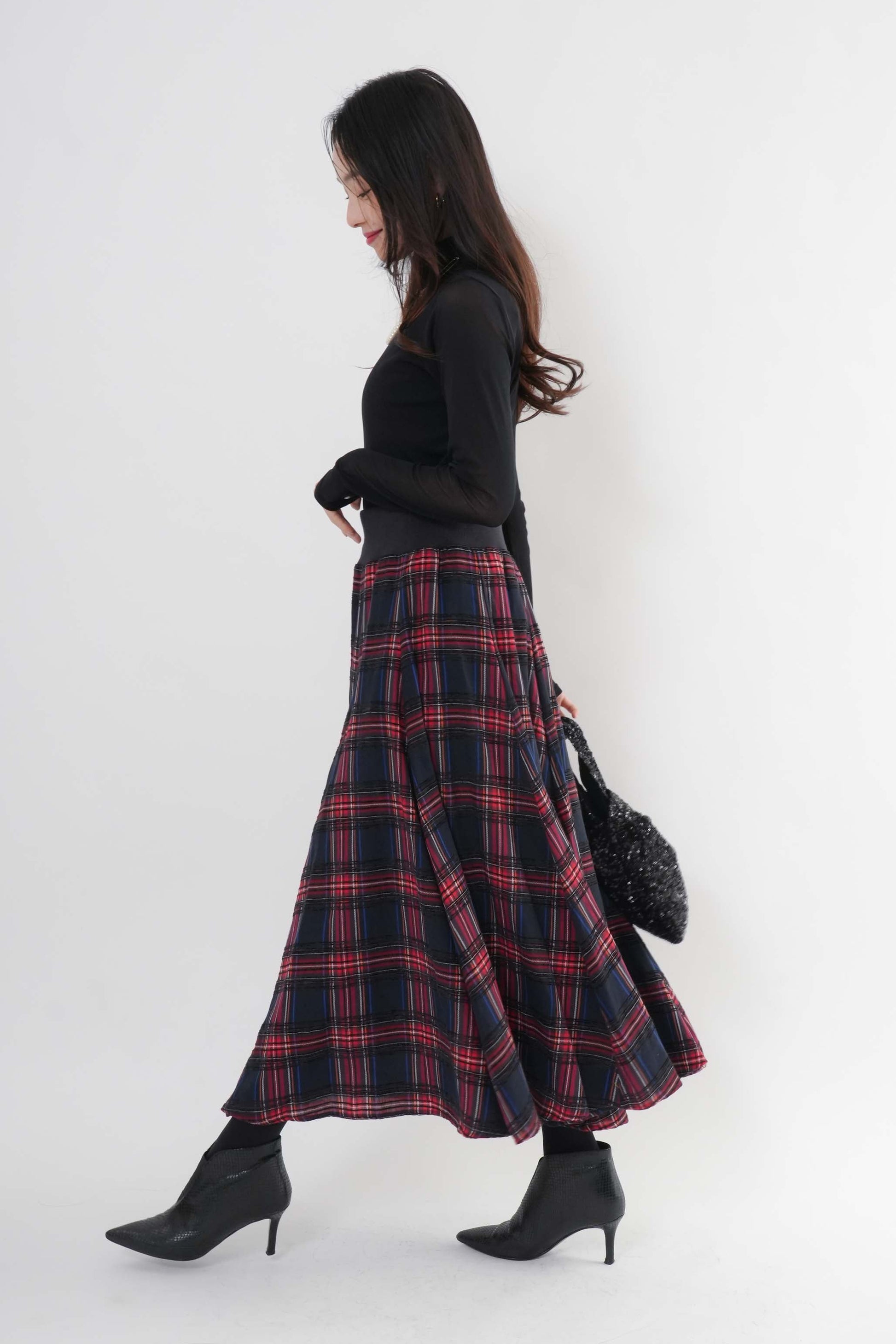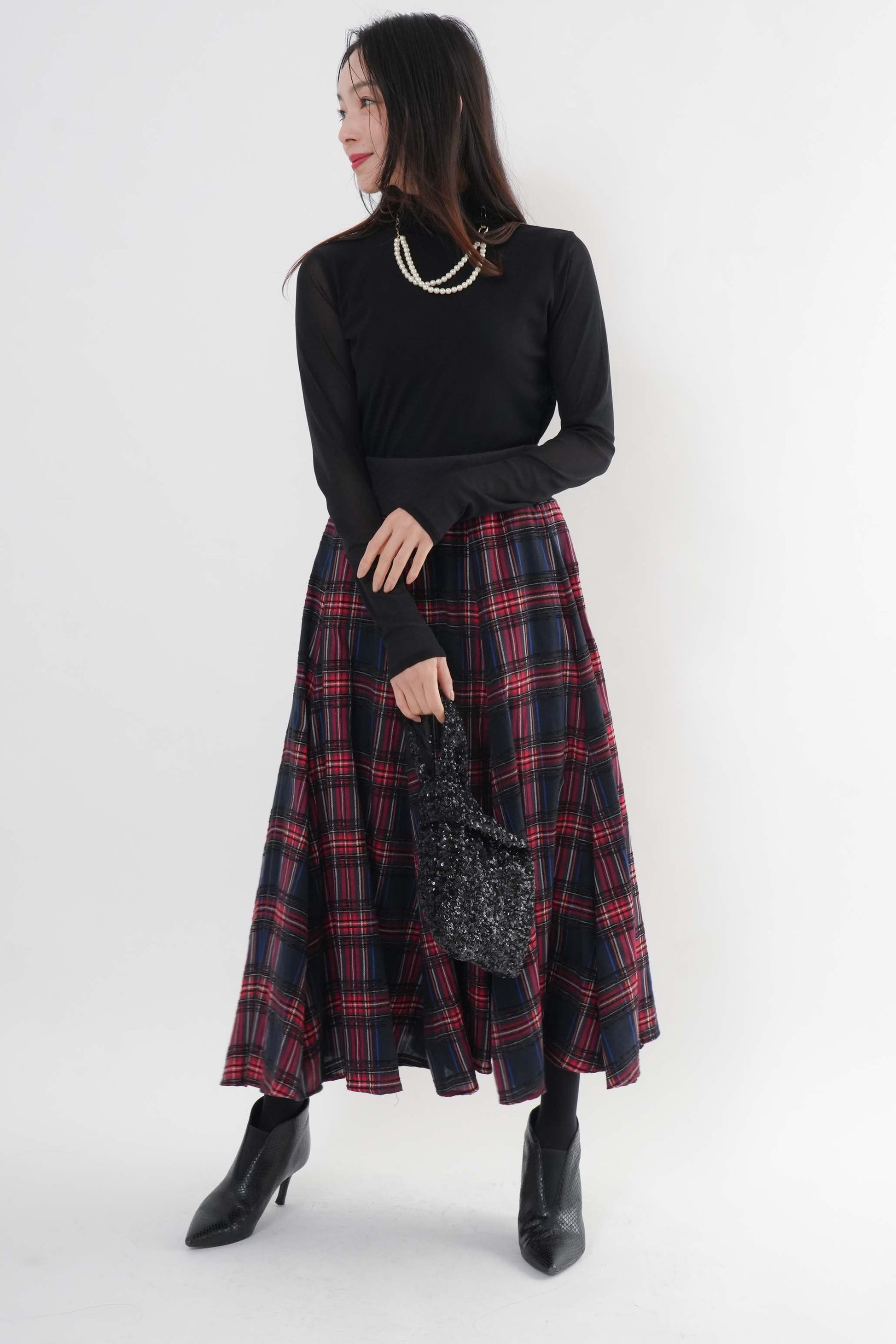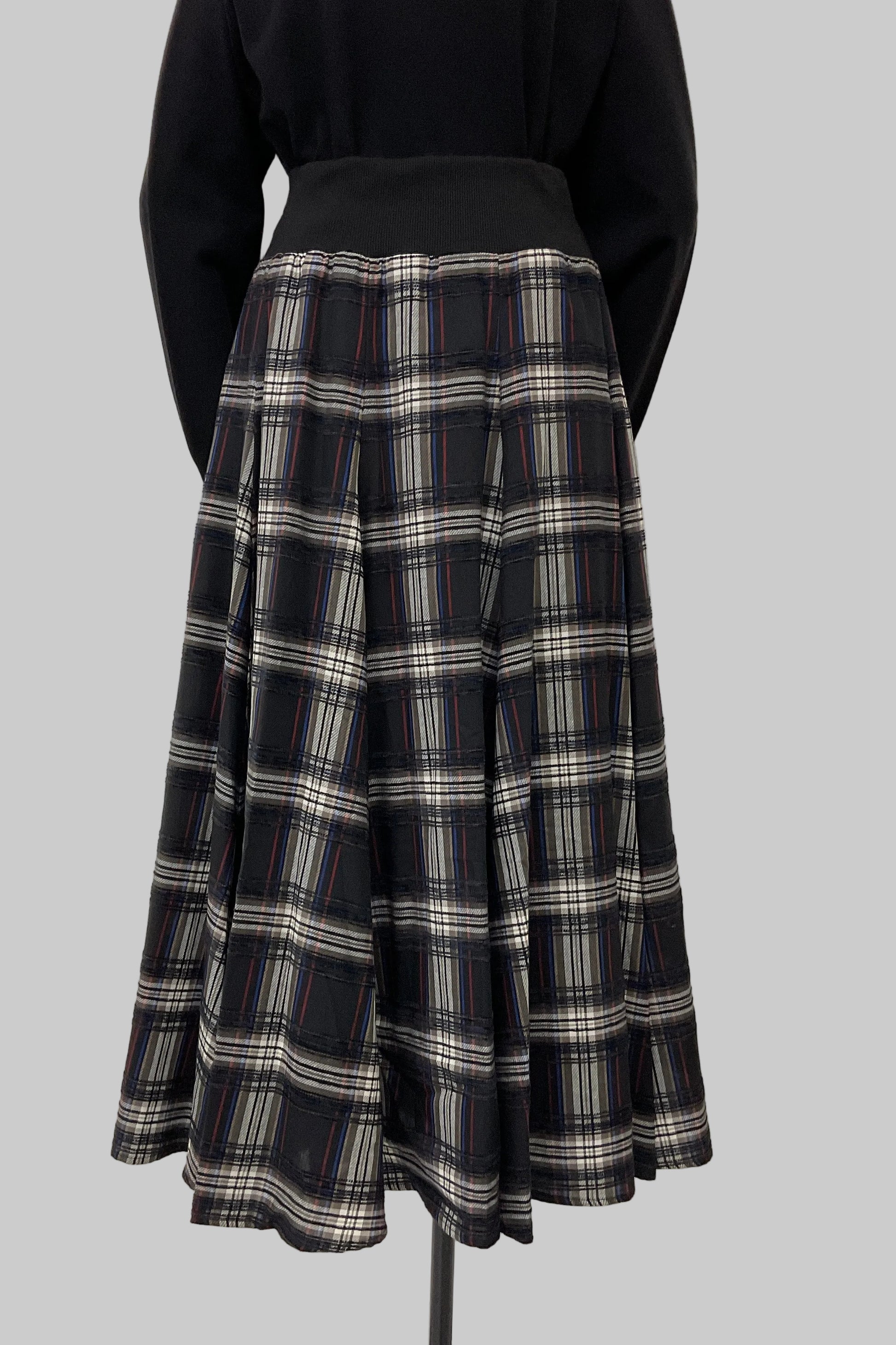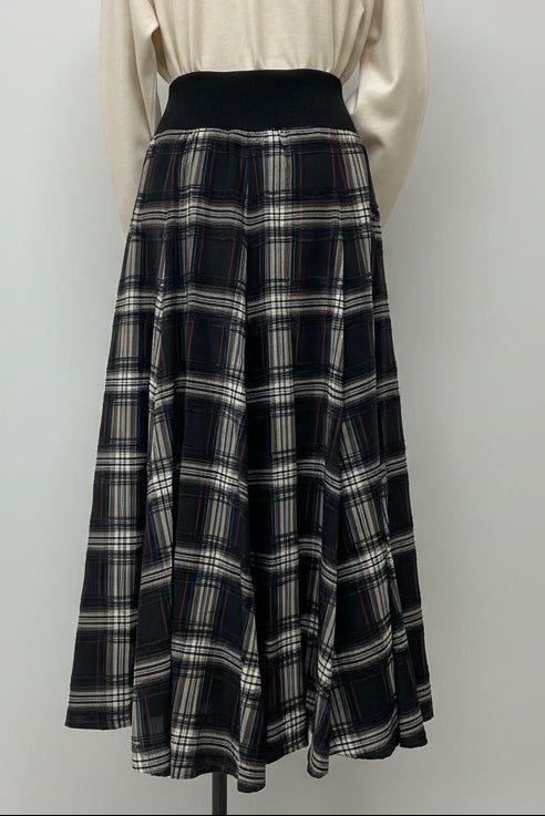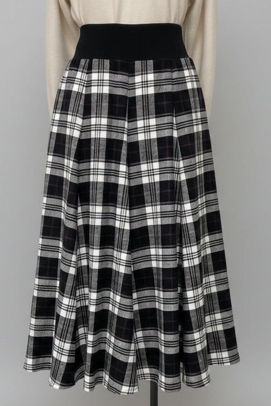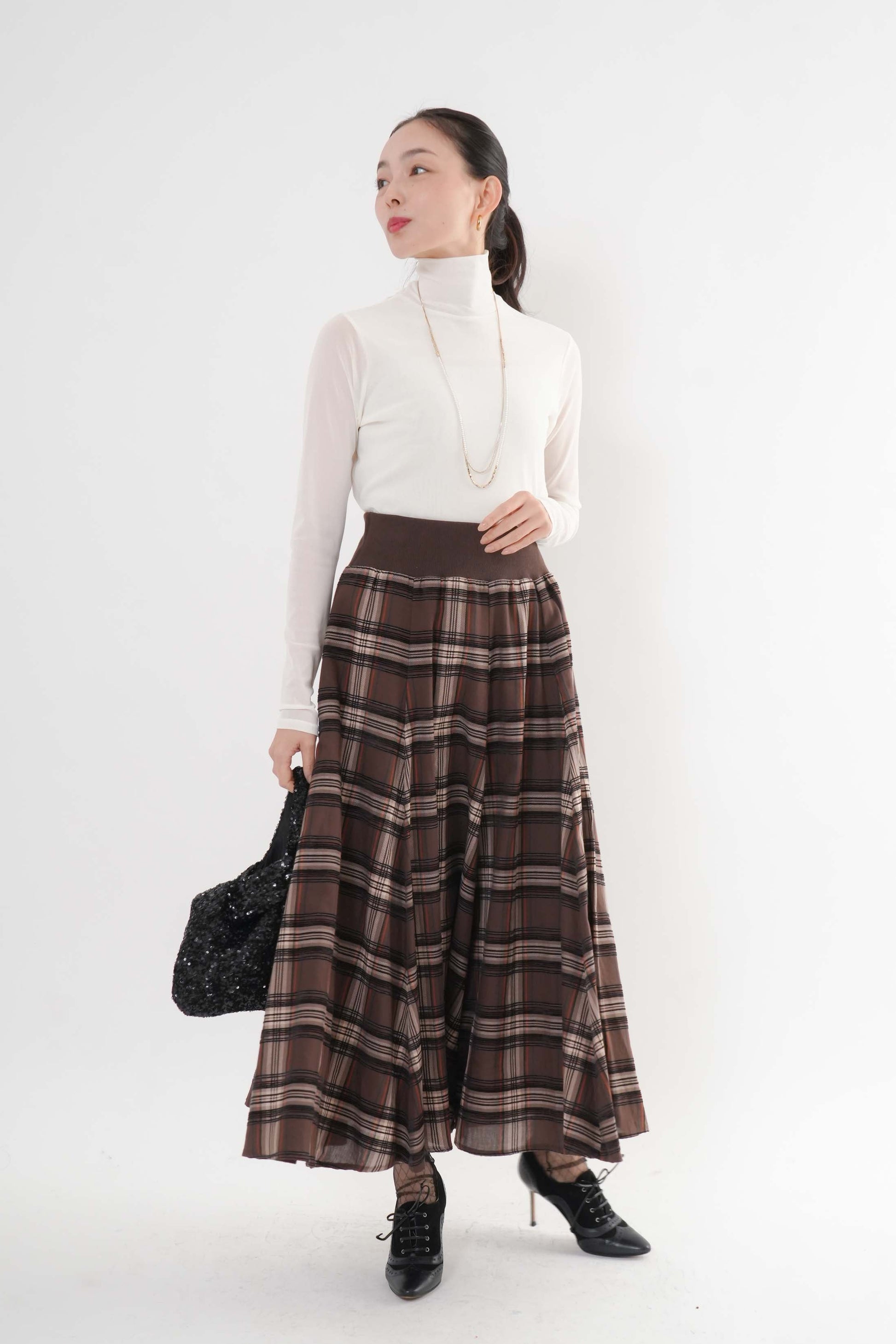 落ち着いたチェック柄に、ふわっと広がるフレアシルエットを添えたロングスカート。 ウエストはゴム仕様で、締めつけ感を抑えながらもウエストマークデザインできます。 気軽に揺れる移動量で、歩くたびに自然な流れで、さりげなく