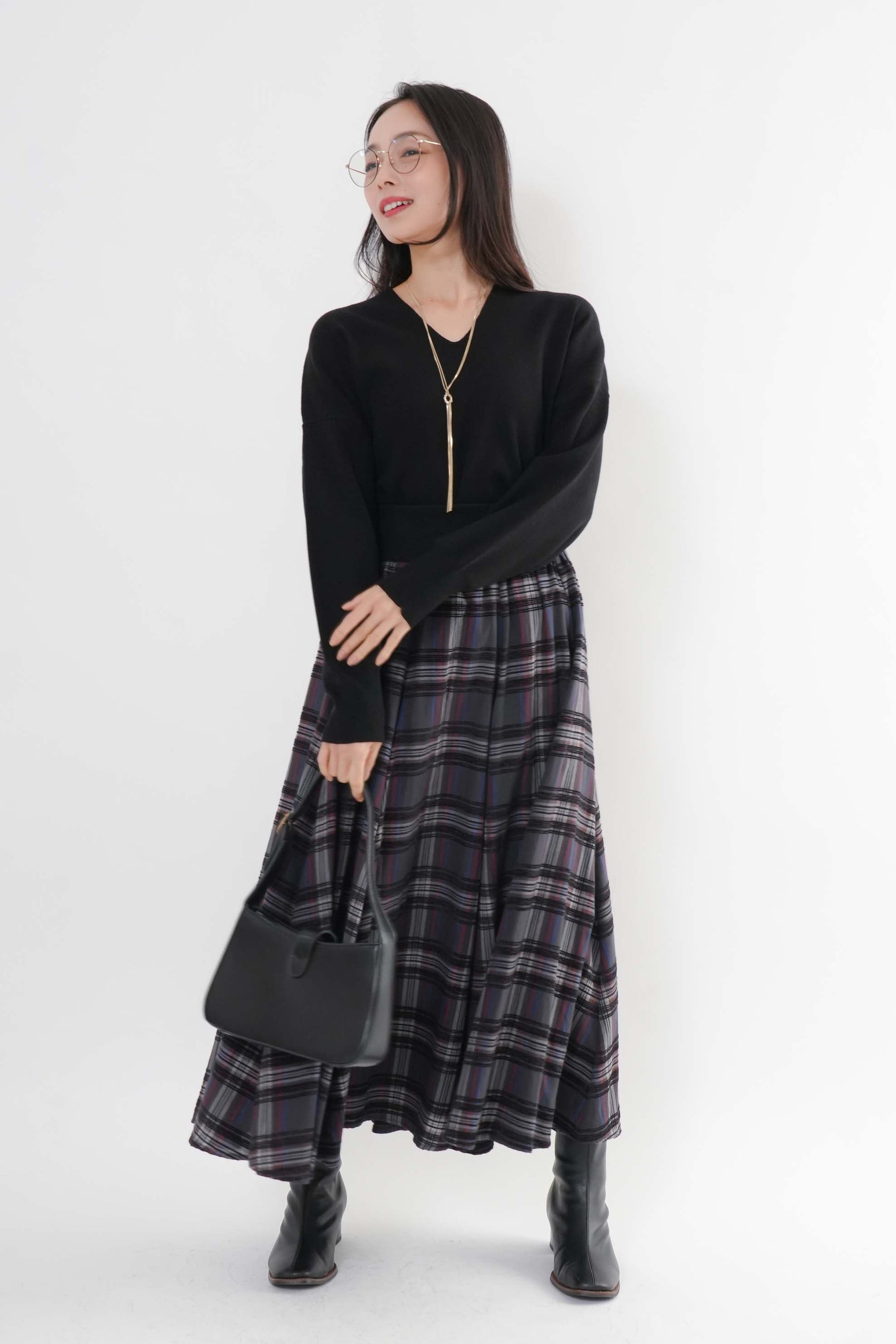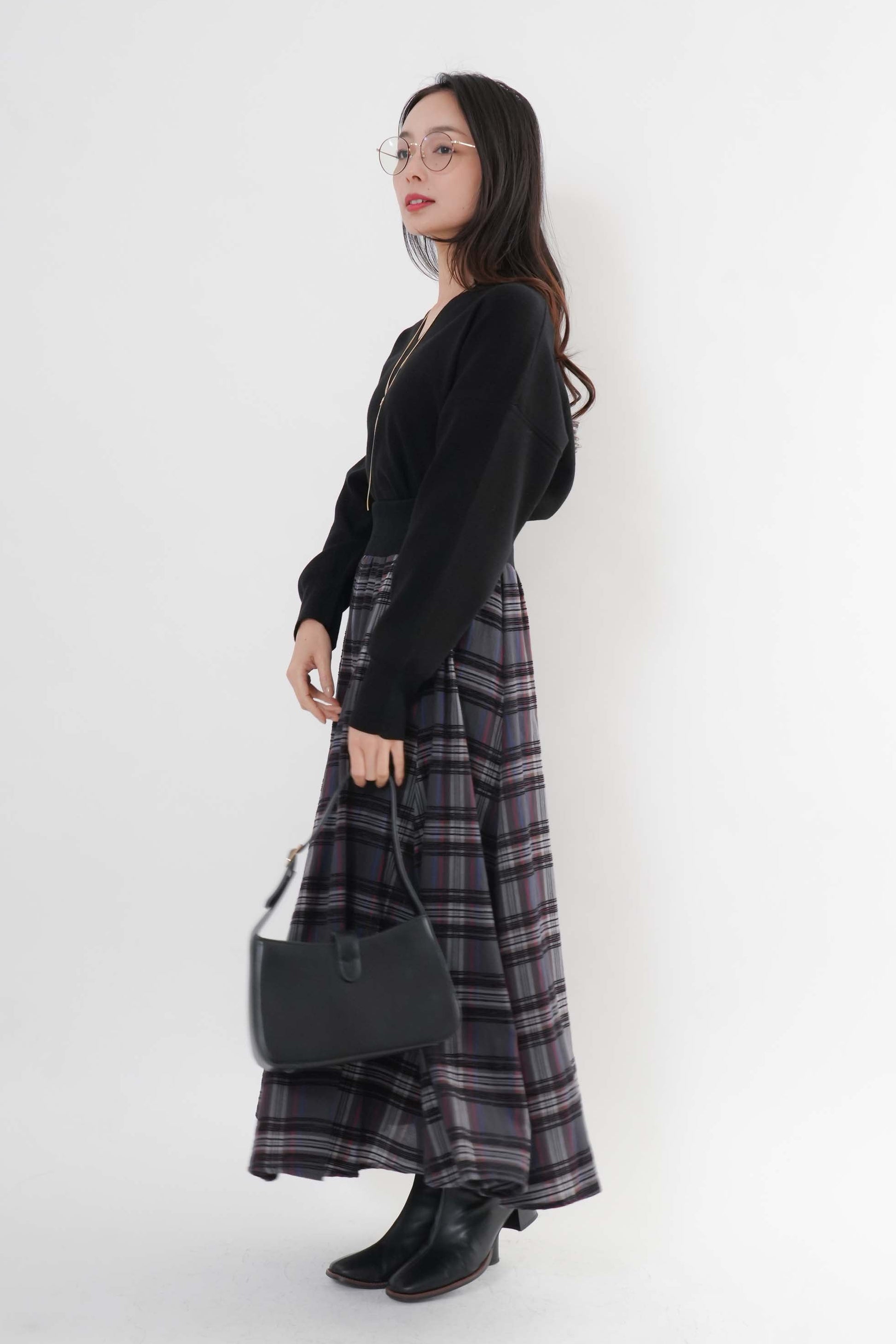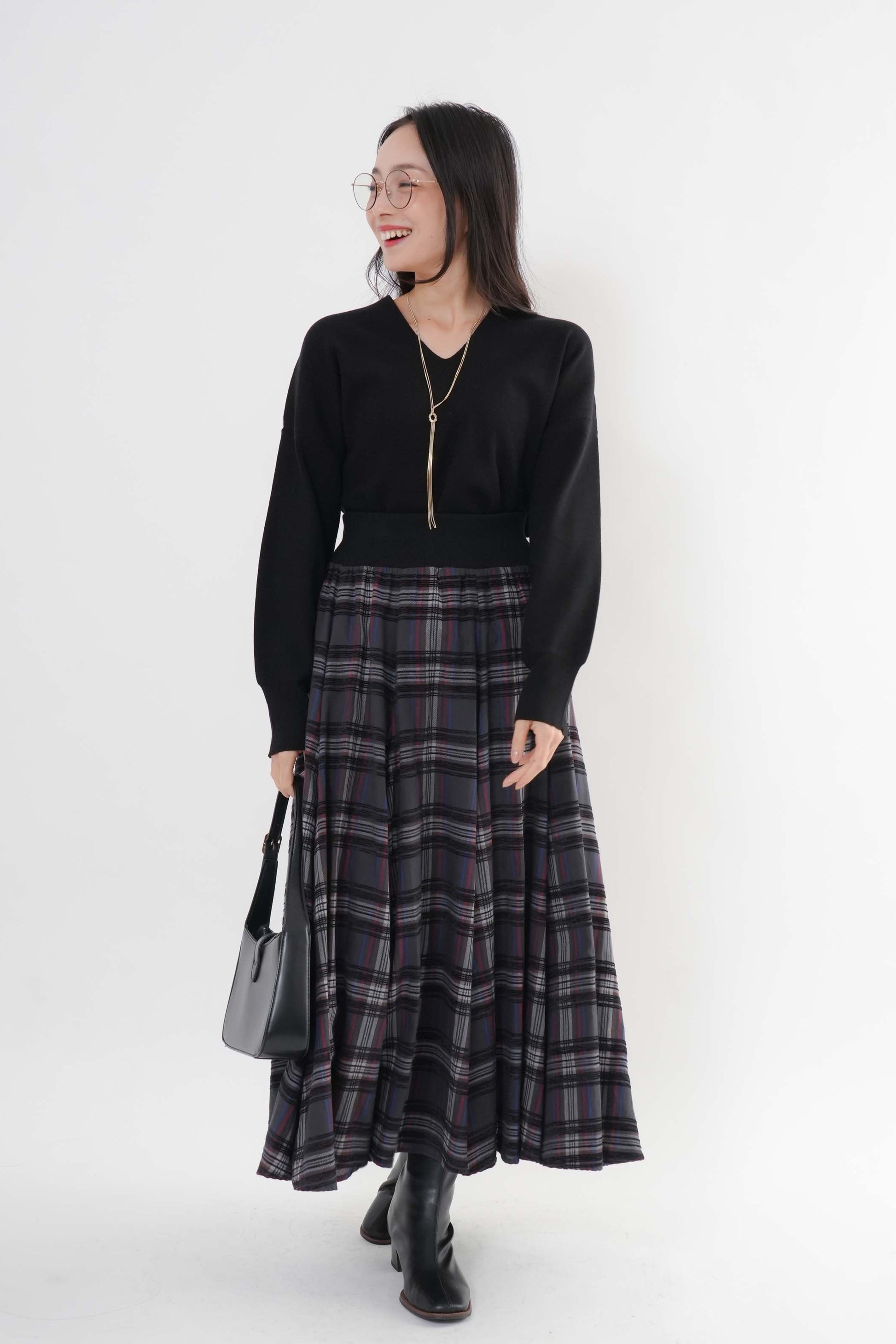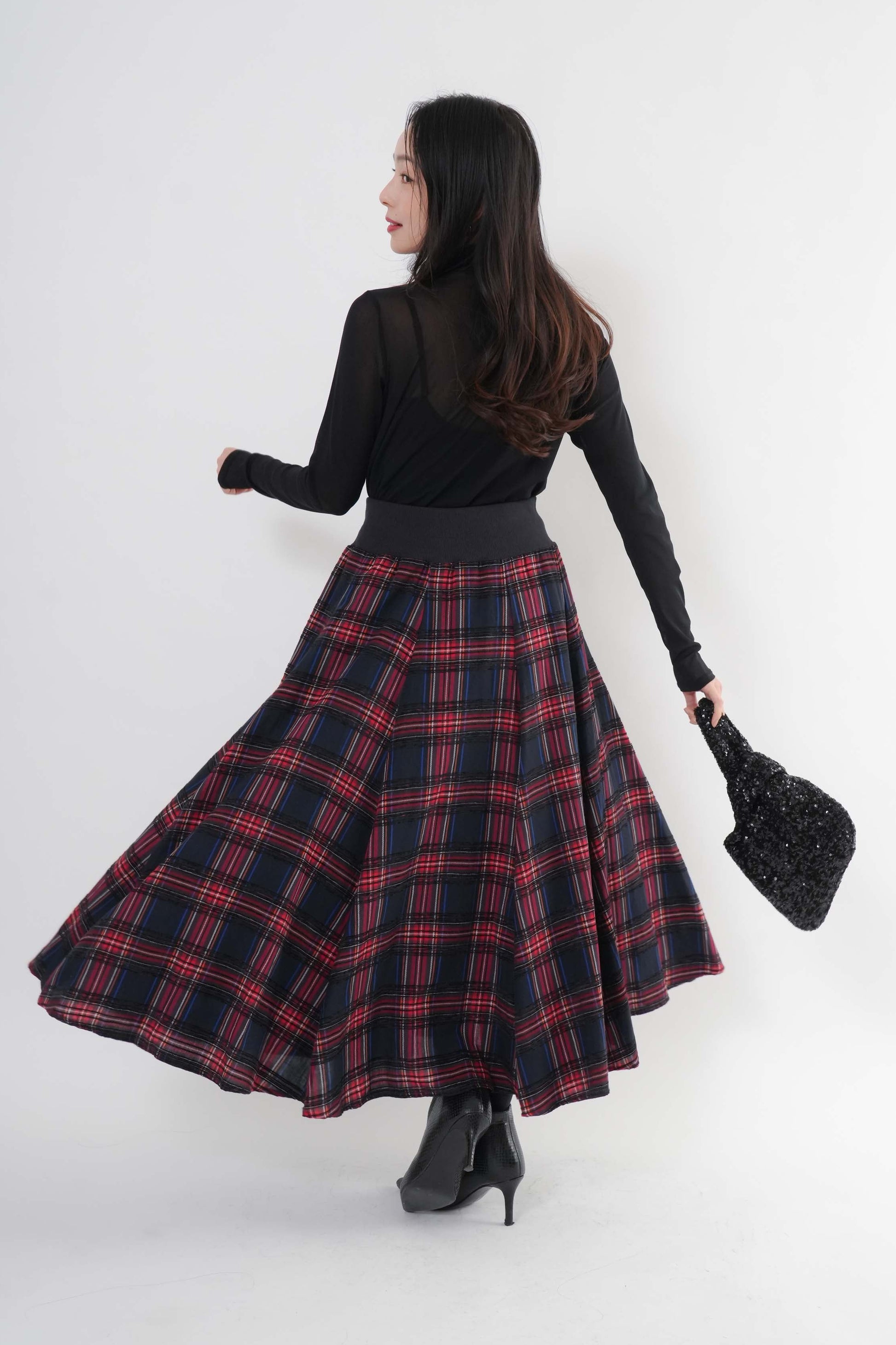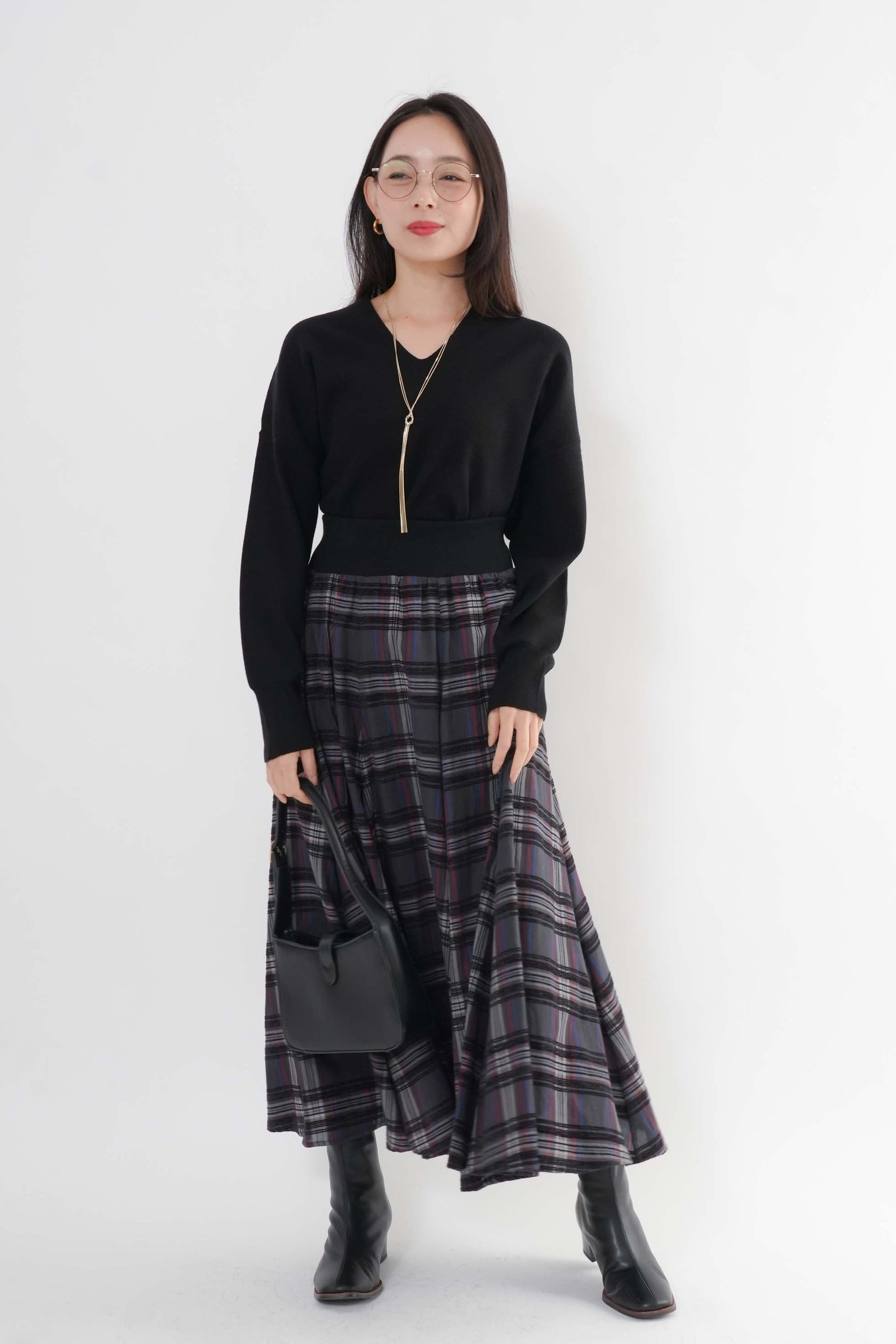 落ち着いたチェック柄に、ふわっと広がるフレアシルエットを添えたロングスカート。 ウエストはゴム仕様で、締めつけ感を抑えながらもウエストマークデザインできます。 気軽に揺れる移動量で、歩くたびに自然な流れで、さりげなく